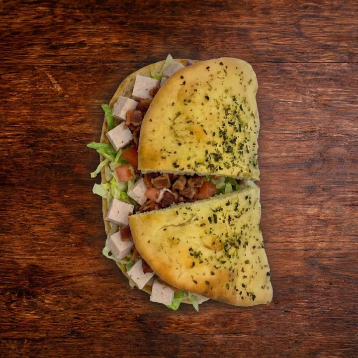 Sliced turkey and bacon topped with lettuce, tomato, mayo, and melted cheese.